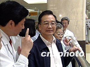 據(jù)中國(guó)中央電視臺(tái)報(bào)道,今天上午9時(shí),溫家寶和中共中央政治局委員、國(guó)務(wù)院副總理吳儀,在中共中央政治局委員、北京市委書(shū)記劉淇,北京市代市長(zhǎng)王岐山陪同下,來(lái)到北京兒童醫(yī)院新門(mén)診大樓。這里擁有國(guó)際一流的就診環(huán)境和診療手段,日門(mén)診量可滿足近萬(wàn)名患兒就診。