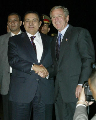 美國總統(tǒng)布什2日抵達埃及度假勝地沙姆沙伊赫,參加與阿拉伯領(lǐng)導人舉行的會議。這次會議旨在為巴勒斯坦新任總理阿巴斯提供支持。圖為埃及總統(tǒng)穆巴拉克(左)以及政府其他高層官員在沙姆沙伊赫機場迎接布什一行。