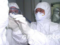 世界衛(wèi)生組織視察組人員六月三日在北京解放軍小湯山醫(yī)院視察北京防治SARS病工作時(shí),和醫(yī)護(hù)人員進(jìn)行交流。作者:安然