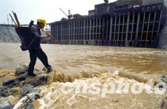 三峽水庫壩前水位六月三日十二時許升至一百一十三米高程。位于三峽壩區(qū)右岸地下電站機組進水口開始進水。圖為三斗坪中堡村移民莊德新正走過機組進水口施工現(xiàn)場。作者:孫榮剛