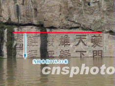 三峽水利樞紐壩前水位6月6日上午10時(shí),達(dá)到121.41米。瞿塘峽平湖景象已呈現(xiàn)出來(lái),而三峽著名的夔門(mén)摩崖石刻此時(shí)已經(jīng)被淹沒(méi)。圖為6月4日當(dāng)水位達(dá)到116.33米時(shí),夔門(mén)摩崖石刻向游人展示出告別前的景觀。中新社 圖