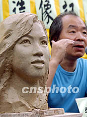 香港新世紀論壇與藝術(shù)界六月九日在香港舉行“為香港英勇殉職的醫(yī)護人士塑像發(fā)布會”,圖為香港藝人朱達誠在發(fā)布會上向媒體介紹有關(guān)雕塑英勇殉職的謝婉雯醫(yī)生銅像詳情。錢興強 攝