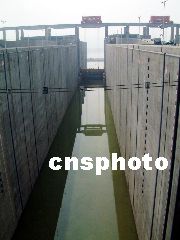 6月9日上午8點左右,三峽水利樞紐壩前水位達(dá)到130.97米,三峽永久船閘的閘室里開始進(jìn)水,大量的江水漫過船閘航道前的大堤,到下午16點,在閘前已經(jīng)是一片汪洋了。到6月16日,三峽永久船閘的試通航,就意味著二次截流以來的翻壩運輸方式將告結(jié)束,大小船只需在2-3小時內(nèi)通過永閘,三峽大壩從此暢通無阻。劉曙松 攝