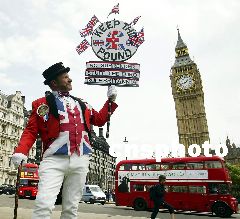 6月9日,英國財政大臣戈登·布朗宣布英國暫時不會加入歐元區(qū)。圖為英鎊的堅定支持者在英國首都倫敦街頭高舉標語牌,號召維護英鎊,抵制歐元。Ic/cnsphoto 攝