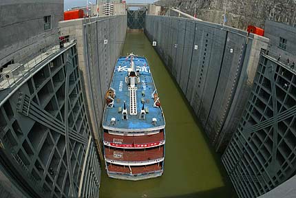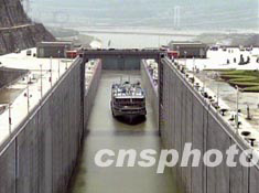 今日上午九時(shí)十分,五閘室水位已經(jīng)降到與下游水位一致,閘門已經(jīng)打開,全長(zhǎng)七十八米、寬十六點(diǎn)四米,定噸三千噸的重慶長(zhǎng)江輪船公司“江渝十五號(hào)”,在經(jīng)過周密安全檢驗(yàn)后由下游緩緩駛?cè)胛彘l室,隨后閘門緩緩關(guān)閉,輸水系統(tǒng)開始充水抬高閘室水位,“江渝十五號(hào)”隨閘室水位上升而上升。