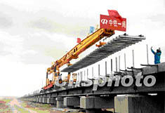六月十二日清晨,青藏鐵路鋪軌順利通過海拔四千六百多米、全長十一點(diǎn)七公里的清水河特大橋。清水河特大橋位于可可西里無人區(qū),是青藏鐵路最長的以橋代路工程和重點(diǎn)控制工程之一!耙詷虼贰敝饕菫榻鉀Q高原凍土地帶路基穩(wěn)定問題,各橋墩間的一千三百多個(gè)橋孔可供藏羚羊等野生動物自由遷徙。作者:趙匡胤