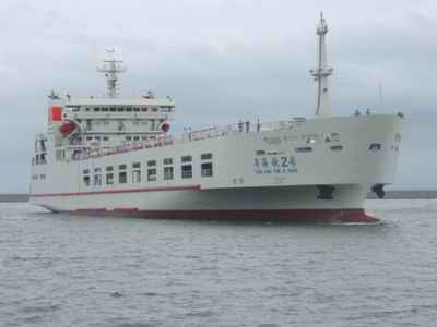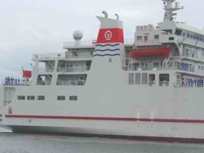 據(jù)了解,“鐵二號(hào)”從設(shè)計(jì)到造型、從長(zhǎng)相到身材,幾乎和“鐵一號(hào)”沒(méi)有什么差異。總長(zhǎng)度一百六十五點(diǎn)四米,寬二十二點(diǎn)六米,排水量一萬(wàn)二千四百噸,載車重量四千二百噸,主甲板可以載貨運(yùn)列車車廂四十節(jié)或客運(yùn)列車十八節(jié)、旅客一千三百六十人。