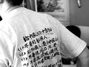 據(jù)《現(xiàn)代快報》報道,該外籍男子當時身著一件后背印有字跡的T恤,上面寫著“給中國人十條告誡”,如“(1)不許盯看外國人,(2)不要跟外國人說HELLO、OK,(3)允許外國人住便宜旅館”等內容。在場的兩位市民許先生和陳先生對“老外”T恤上的文字表示不滿,當即上前讓其脫下該衣服,在場的其他市民也紛紛附和。