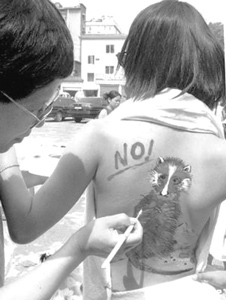 問題是,如今的人體彩繪,已不滿足于在藝術(shù)殿堂里,而是在室外在大庭廣眾之下大行其道,其目的也不是要普及什么藝術(shù)文化,所圖的或許只有一個動機,那就是為商家推銷商品。這就值得認真分析了。