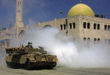 6月17日,在約旦河西岸納布盧斯附近的阿斯卡爾難民營里,一輛以色列坦克在一座清真寺前駛過。在當天這一地區(qū)發(fā)生的巴以沖突中,以色列軍隊開槍打傷兩名巴勒斯坦人。