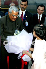 二十二日晚乘專(zhuān)機(jī)抵達(dá)北京的印度總理瓦杰帕伊在機(jī)場(chǎng)接受印度小姑娘獻(xiàn)上的鮮花。中新社記者:鄭萍萍