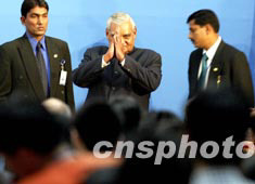 二十三日在北京大學(xué)舉行演講的印度總理瓦杰帕伊,向起立歡迎他的北大學(xué)生致謝。中新社記者:鄭萍萍