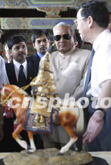 印度總理瓦杰帕伊二十四日參觀北京故宮博物院,陪同參觀的故宮博物院院長(zhǎng)鄭欣淼向瓦杰帕伊贈(zèng)送彩陶工藝品“乾隆皇帝閱兵像”。中新社記者:毛建軍