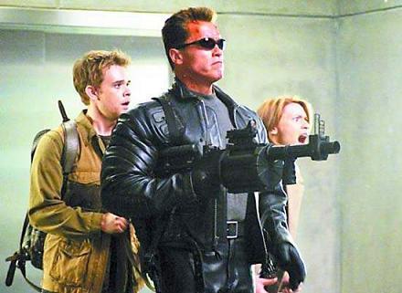 《終結(jié)者3》7月2日上映,這之前有記者采訪了男主角施瓦辛格,見到他時(shí),他正在和他四歲的兒子克里斯多佛在飯桌上玩國(guó)際象棋。當(dāng)時(shí)施瓦辛格在棋局中處于劣勢(shì),看到我們,他干脆將木質(zhì)棋盤放到一邊,并搬來(lái)幾張椅子,還派發(fā)飲料,很開心地接受采訪。在他舒服地坐在凳上的時(shí)候,卡其布短褲下膝蓋上的疤痕清晰可見。在整個(gè)采訪的過程中,克里斯多佛會(huì)不時(shí)地爬到他爸爸身上扯他的耳朵,不過施瓦辛格也不在意,繼續(xù)我們的談話,談他拍《終結(jié)者3》的事情。談話中,施瓦辛格說(shuō):“我曾說(shuō)過,我會(huì)回來(lái)的,現(xiàn)在,我回來(lái)了。”采訪最后,他還強(qiáng)調(diào)“有人說(shuō)我老了,我會(huì)證明給他們看,我像20年前一樣棒!