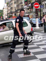 2003年6月的法國(guó)巴黎,天氣晴朗,一名警察腳踏排輪穿梭街道巡邏,以快速應(yīng)變狀態(tài)對(duì)付罪案發(fā)生。盧峰 攝