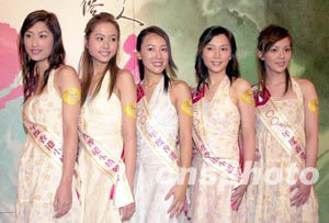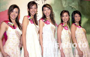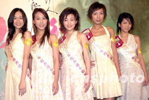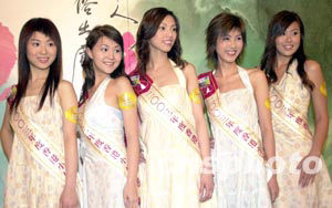 「2003年香港小姐競選」6月26日舉行「鉆石肌膚獎(jiǎng)」記者會(huì),二十位候選佳麗再度亮相,圖為11─15號(hào)候選佳麗,楊洛婷、吳幸美、詹德貞、鄧源慧、陳榕梅 (左起)。 中新社記者 鄧慶樂