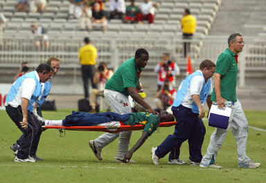 第六屆國(guó)際足聯(lián)聯(lián)合會(huì)杯足球賽半決賽26日法國(guó)的里昂和巴黎舉行?溌£(duì)擊敗哥倫比亞隊(duì),法國(guó)隊(duì)淘汰土耳其隊(duì),均躋身決賽。但不幸的是,喀麥隆隊(duì)的著名球星維維安·福在比賽過(guò)程中猝死。