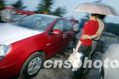 一對(duì)情侶二十七日晚在北京街頭冒雨觀看心儀的新款車(chē)型。由首都汽車(chē)股份公司主辦的汽車(chē)展示周活動(dòng)二十七日晚在北京郡王府前的噴泉廣場(chǎng)揭幕。這是北京“雙解除”后,舉行的系列消夏活動(dòng)之一。中新社記者:毛建軍