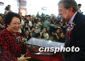 WHO駐華顧問羅伯特.帝茲接收全國(guó)政協(xié)委員、中國(guó)紫檀博物館館長(zhǎng)陳麗華女士贈(zèng)送的紫檀木雕如意,接收這份各界感謝WHO支持中國(guó)戰(zhàn)勝SARS病毒的心意。中新社記者:賈國(guó)榮