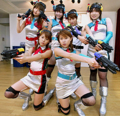 28日,日本青春少女為T(mén)OMY玩具公司新近推出的紅外玩具槍在東京做促銷。這種叫作'Survivor Shot Revolv'的紅外玩具槍還包括一個(gè)無(wú)線接收器,日本市場(chǎng)售價(jià)2580日元(25美元)