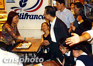 六月三十日,國務(wù)院總理溫家寶在香港新城市廣場參觀,圖為他在快餐店與市民交談。中新社記者 潘索菲 攝