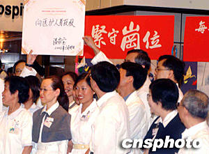 國務(wù)院總理溫家寶,三十日到首先爆發(fā)非典型肺炎的沙田威爾斯親王醫(yī)院探訪,溫家寶對于因為挽救病人性命而犧牲的醫(yī)護人員,他銘記于心 。并即場寫上「向醫(yī)護人員致敬」的題字。中新社記者 錢興強 攝