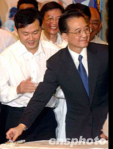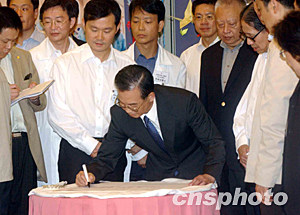 訪港的國務(wù)院總理溫家寶,六月三十日視察沙田威爾斯親王醫(yī)院,并即場寫上「向醫(yī)護人員致敬」的題字。中新社記者 錢興強 攝