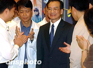 國務(wù)院總理溫家寶六月三十日到首先爆發(fā)非典型肺炎的沙田威爾斯親王醫(yī)院視察,溫家寶一到場就逐一同醫(yī)護人員握手,說:辛苦你們了。中新社記者 錢興強 攝