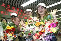 下午二時(shí)左右,當(dāng)六十名韓國游客走進(jìn)候機(jī)大廳時(shí),早已在這里守候的歡迎人群立刻沸騰了起來。身著節(jié)日盛裝的姑娘們向來賓獻(xiàn)上鮮花和紀(jì)念品,歡迎來自韓國的勇敢的客人。