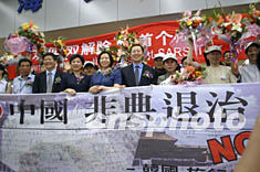 北京“雙解除”后,第一個(gè)境外旅游團(tuán)6月30日抵達(dá)北京。由60名韓國(guó)各界人士組成的旅游團(tuán)在北京機(jī)場(chǎng)向北京人民贈(zèng)送“祝賀中國(guó)戰(zhàn)勝非典”的橫幅。中新社記者 史利 攝