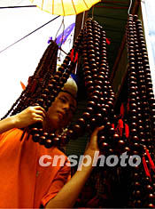 六月三十日,一名小男孩在北京一處寺廟旅游圣地選擇旅游紀(jì)念品。北京旅游“禁令”解除后,旅游紀(jì)念品攤點(diǎn)爭(zhēng)相開業(yè),以減少“非典”造成的損失。中新社記者 宋吉河 攝