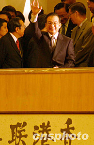 溫家寶甫走入會(huì)場,即向在場人士揮手致意,且和很多工作人員握手,還與一些工作人員親切交談,有工作人員要求和溫家寶合影,他也滿足了他們的要求。溫家寶穿上一件編號(hào)“6638”的紅色出市背心,這是一組喻意好運(yùn)的數(shù)字。
