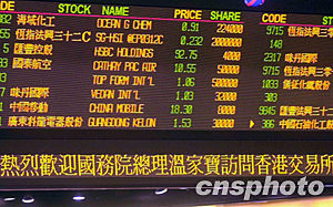 中新社香港六月三十日電 國務(wù)院總理溫家寶今天下午在香港特首董建華及財(cái)政司司長梁錦松陪同下參觀香港交易所。溫家寶到場時(shí),在場交易所工作人員紛紛站立,且以熱烈掌聲歡迎總理一行。