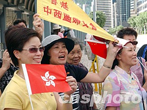 香港特區(qū)政府為慶祝回歸祖國六周年,7月1日早上在灣仔金紫荊廣場舉行升旗禮,圖為參與觀禮的市民十分興奮。中新社記者 錢興強(qiáng) 攝