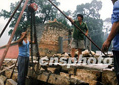 北京市政工人七月初正在整修明十三陵一處未開放皇陵的臺階。正在法國巴黎召開的聯(lián)合國教科文組織第27屆世界遺產大會將于當?shù)貢r間7月3日即北京時間7月4日通過大會審議投票,最終決定十三陵是否能跨進“世遺”門檻。中新社記者 滿會喬 攝