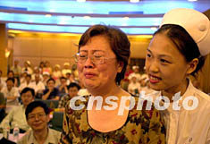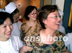中新社廣州七月二日電 (記者王華)廣東省最后三名非典病人今天上午全部康復出院,患者與醫(yī)護人員相互擁抱慶賀。廣東省副省長雷于藍等有關(guān)負責人參加了歡送會。