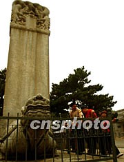 七月四日,中國北京明十三陵作為明清皇家陵寢的擴(kuò)展項(xiàng)目被列入世界文化遺產(chǎn)名錄,一時(shí)吸引不少游人前來參觀。圖為游客對(duì)十三陵中定陵前的石碑產(chǎn)生濃厚興趣,明十三陵每處皇陵前都有類似烏龜馱石碑的石雕。中新社記者 宋吉河 攝