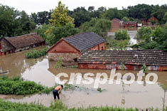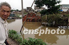 七月四日,安徽淮河分洪仍在繼續(xù),不少淮河岸邊低洼地區(qū)的房屋被水淹,一位房屋的主人不忍再看被淹的房屋。中新社記者 盛佳鵬 攝