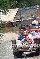 七月四日,安徽阜陽縣一戶農(nóng)民全家乘坐拖拉機轉(zhuǎn)移到高地。由于安徽淮河分洪,部分低洼地區(qū)的房屋被淹。中新社記者 盛佳鵬 攝