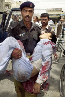巴基斯坦西南部城市基達的一個什葉派穆斯林的清真寺內4日發(fā)生自殺爆炸事件,至少15人死亡,數(shù)十人受傷。圖為巴基斯坦警察正在運送受傷人員。