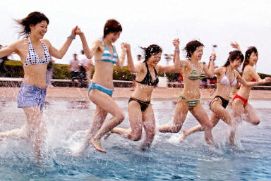 圖:身穿性感比基尼的日本女孩奔向游泳池