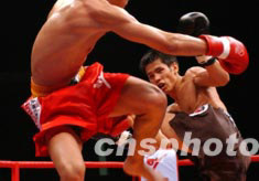 四日晚,因“非典”停賽近三個月之久的中國武術(shù)散打王爭霸賽在北京重燃戰(zhàn)火。中新社記者:武仲林