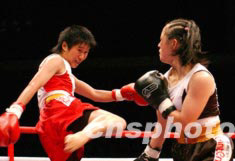 女子表演賽首次進(jìn)入中國武術(shù)散打王爭霸賽,圖為河南隊劉瑞清與湖北隊廖啟燕(右)在48公斤級比賽中。