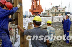圖:搶險(xiǎn)人員打樁加固上海軌道交通4號(hào)線