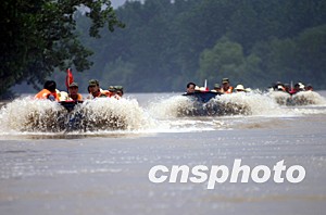 圖:安徽淮河分洪區(qū)沖鋒舟密切巡查水情