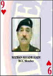 美軍中央司令部當(dāng)天發(fā)表聲明說(shuō),伊拉克阿拉伯復(fù)興社會(huì)黨的一名地區(qū)領(lǐng)導(dǎo)人、伊革命指揮委員會(huì)成員哈迪8日向駐巴格達(dá)的美軍投降。他在被美軍通緝的55名前伊拉克高官名單中排名第23位,在美軍撲克牌通緝令中為紅桃9。