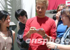 香港歌星張學友,七月十二日接受香港新城電臺“家天下”節(jié)目專訪,等候的歌迷爭相請張學友簽字。中新社傳真 錢興強 攝