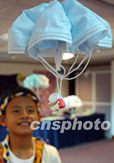 日前,香港舉行由港、臺兩地藝術家、民間人士以及小學生制作的以抗煞SARS時期口罩為題材的藝術作品展,圖為口罩制作的“降落傘”。中新社記者:錢興強