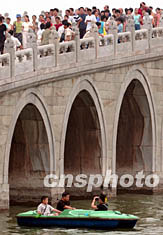 七月十三日,北京頤和園著名景點十七孔橋上人頭攢動。當(dāng)天,實行優(yōu)惠票價的頤和園迎來“非典”疫情后的最高客流量。中新社記者:張煒