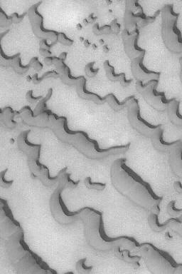 7月13日,來自美國(guó)國(guó)家航空和宇航局(NASA)的火星全球測(cè)量員(MGS)和火星衛(wèi)星照相機(jī)(MOC)的圖片顯示,火星北極冰冠附近的沙丘。冰冠被大片受風(fēng)吹蝕的黑暗沙丘包圍。
